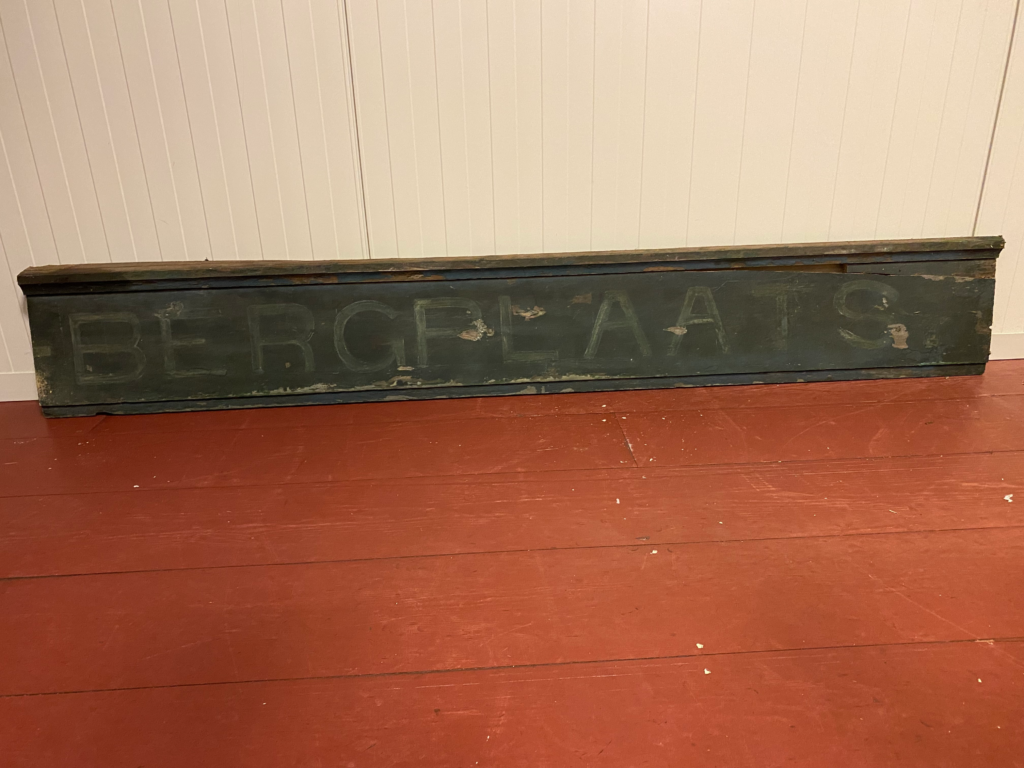 De afmetingen van het bord zijn 180 x 30 cm. Op het bord is met witte letters het woord ‘Bergplaats’ geschilderd op een blauwe achtergrond. Vermoedelijk heeft het bord in de jaren vijftig van de vorige eeuw in het gebouw gehangen.